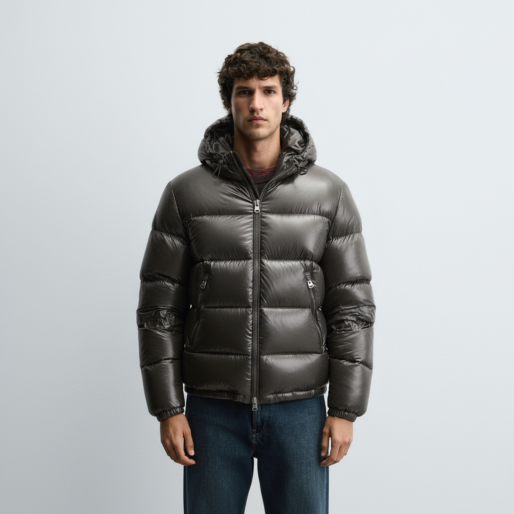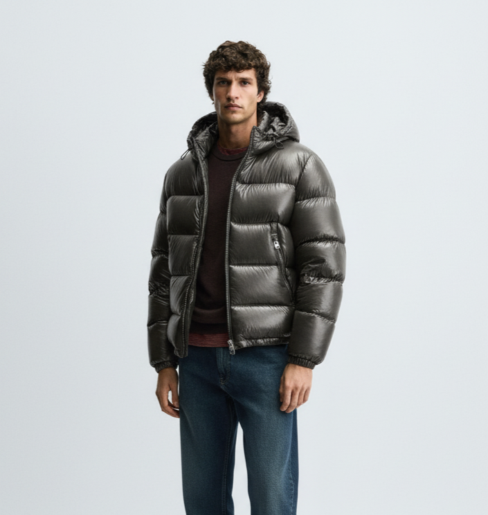 Padded jacket made of technical fabric with a glossy finish. Interior filled with a blend of feather and down. High collar with adjustable hoodie and long sleeves with elasticated cuffs. Welt pockets at the hip and an inside pocket detail. Adjustable hem with elastic at the sides. Front zip fastening.
