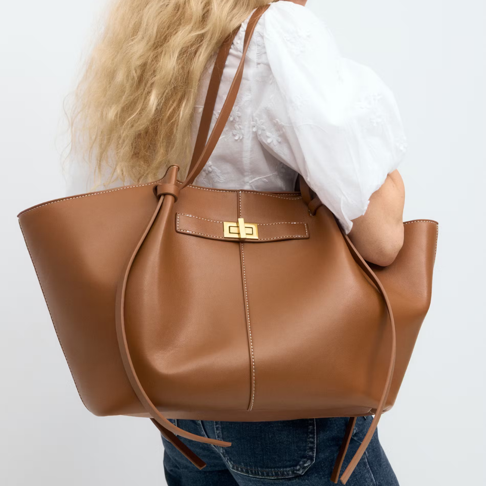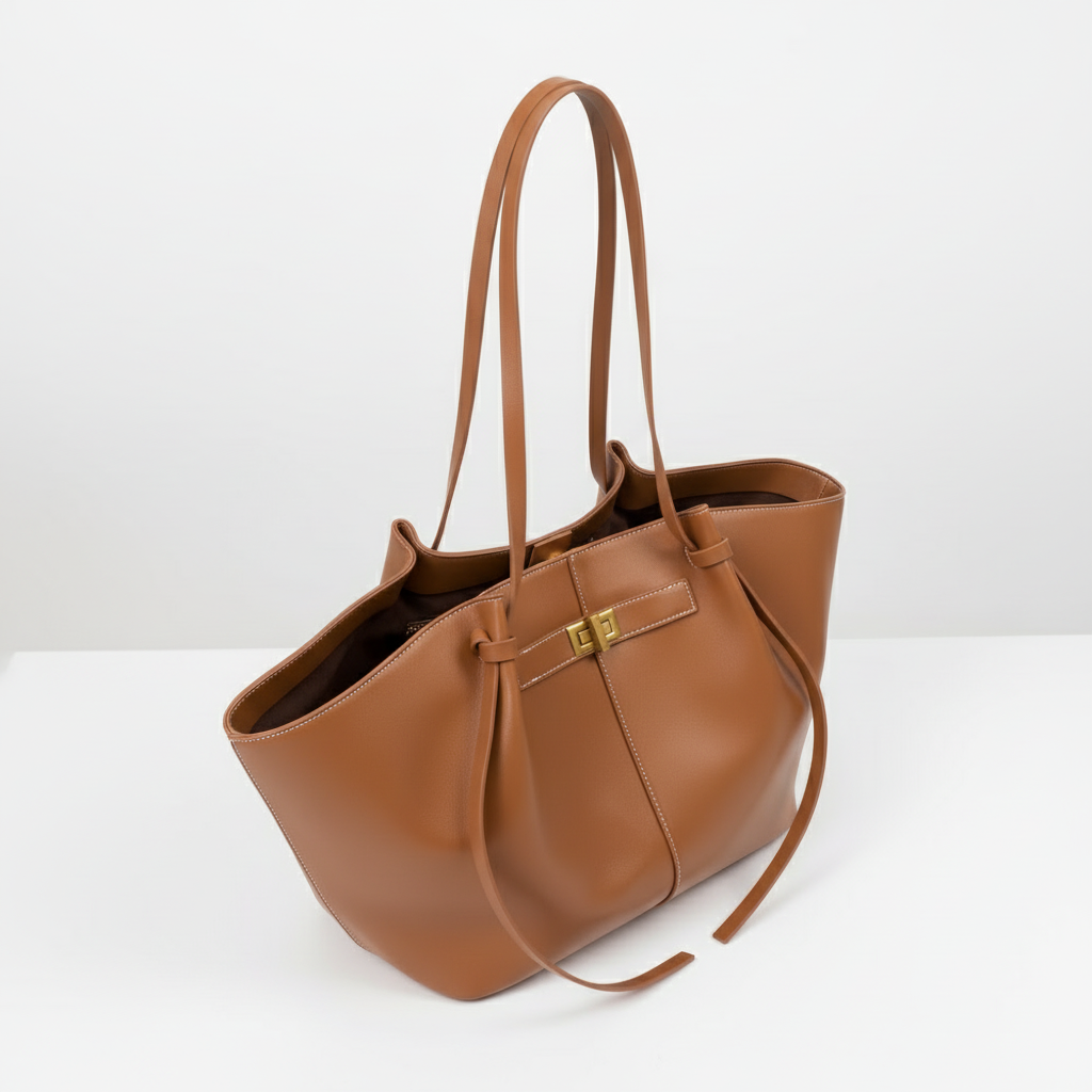 The Tote Bag Céleste® is crafted in premium vegan leather with a soft yet structured silhouette. Featuring double shoulder straps, a golden buckle, and refined leather ties, it elevates any outfit with timeless elegance.