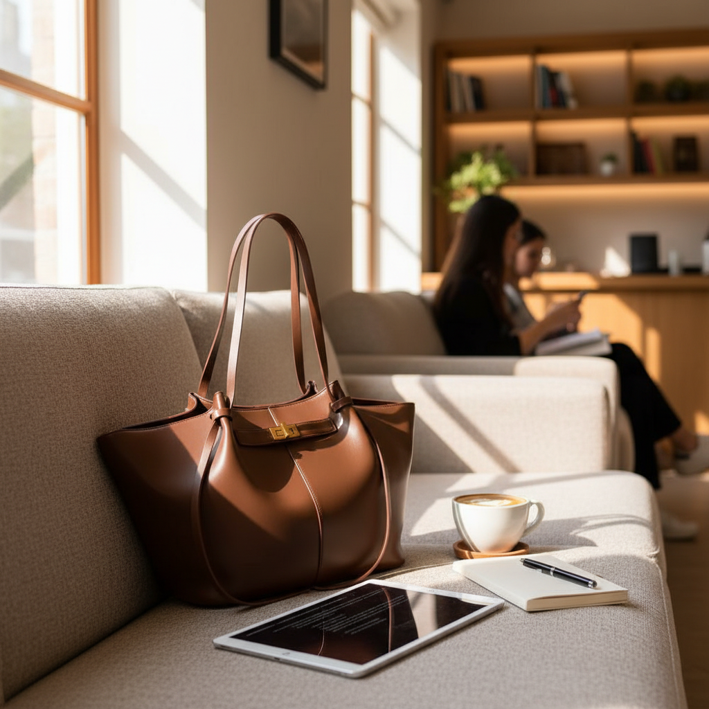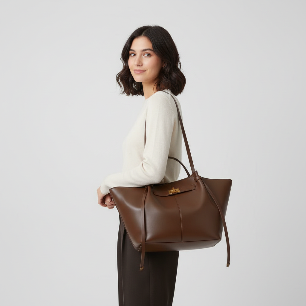 The Tote Bag Céleste® is crafted in premium vegan leather with a soft yet structured silhouette. Featuring double shoulder straps, a golden buckle, and refined leather ties, it elevates any outfit with timeless elegance.